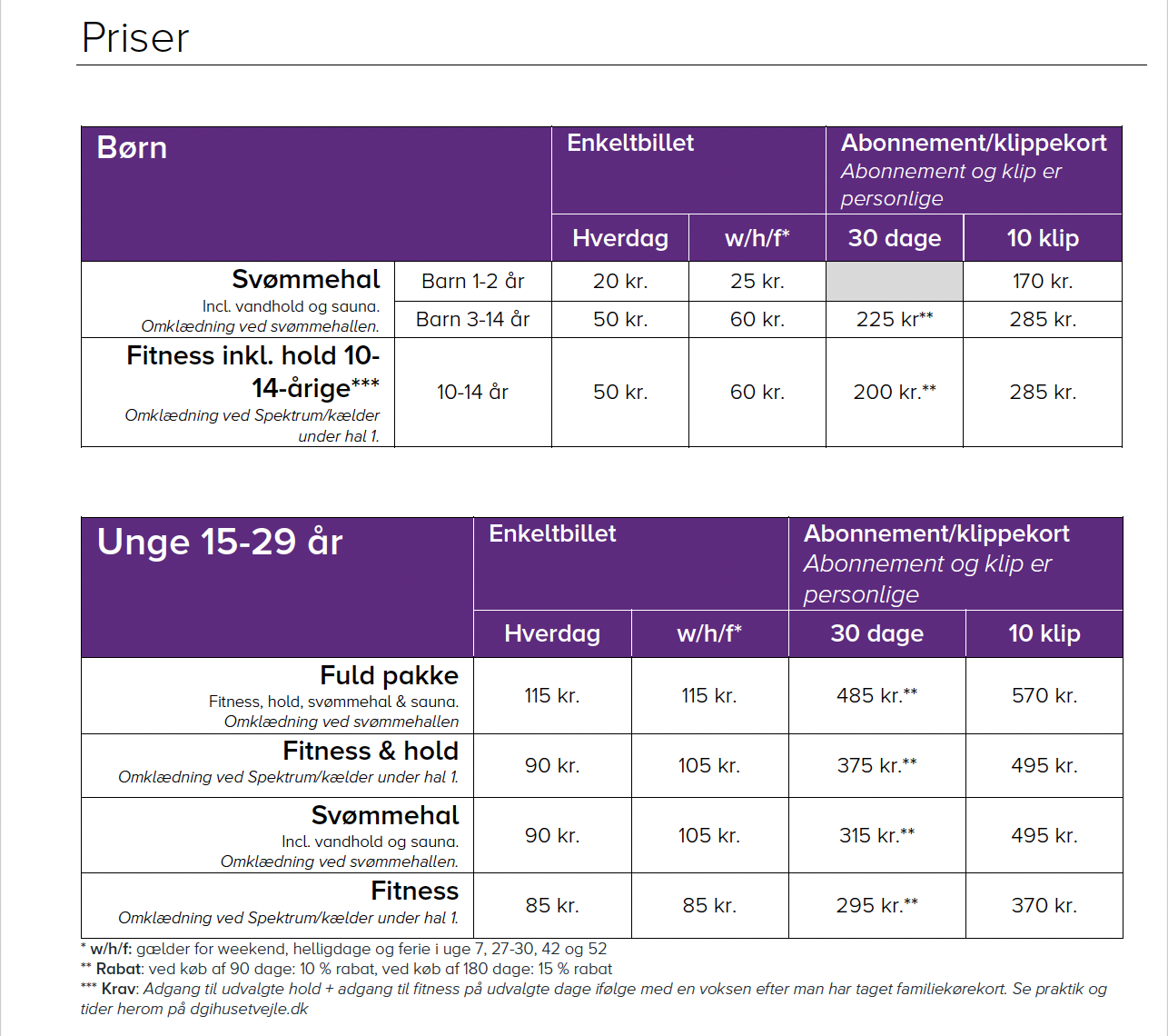| Svømmehal & vandhold | Ikke mulig | Ikke mulig | 850,00 kr |